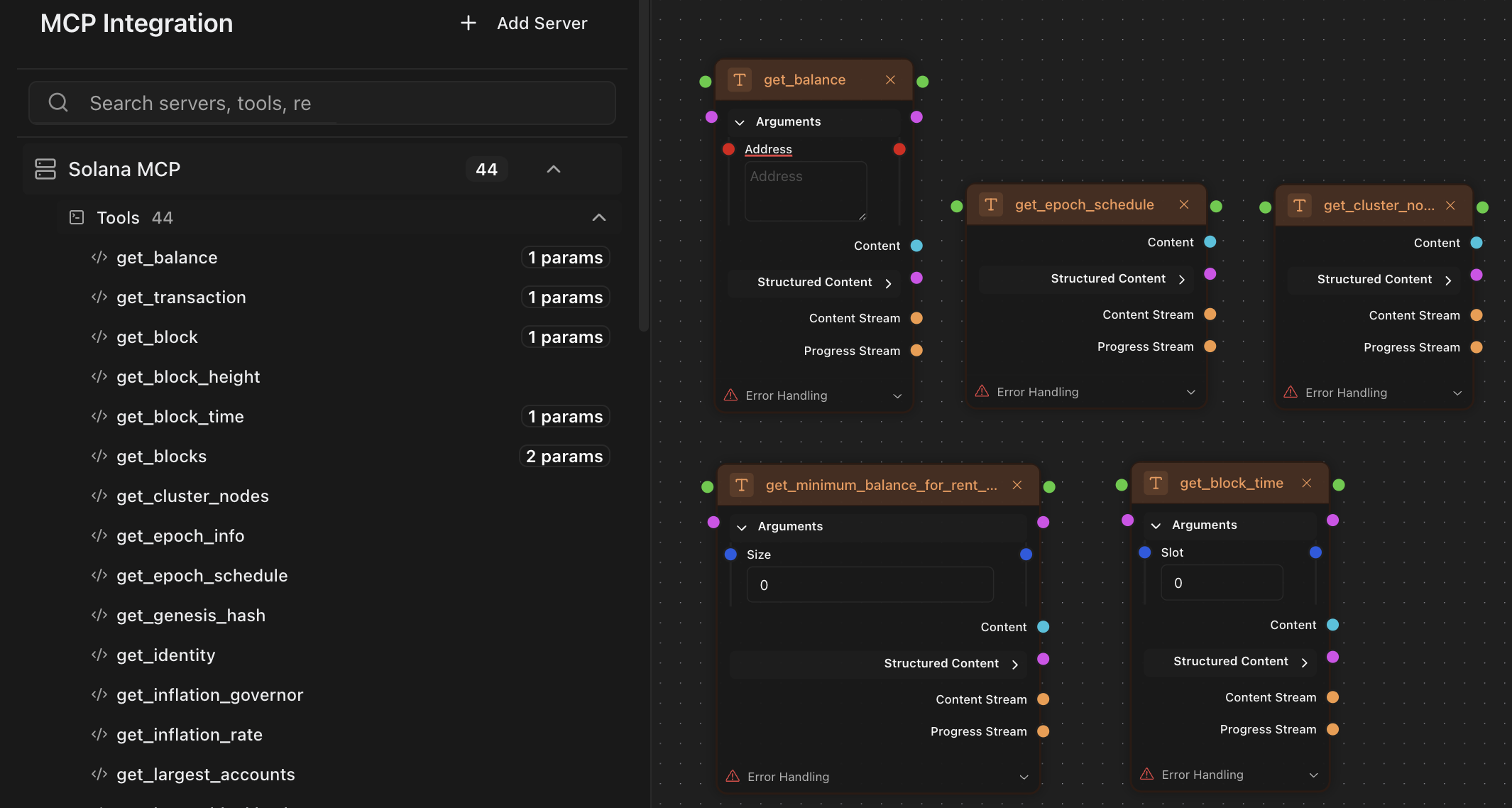 Connected MCP servers expose their available tools through PersistentAI's dynamic tool calling system, which automatically generates properly typed input schemas and handles complex parameter validation. The framework supports mutable output schemas that adapt based on tool definitions, enabling workflows to work with diverse data structures returned by different tools. Real-time progress streaming provides immediate feedback during long-running tool operations, with comprehensive error handling that captures and propagates detailed failure information for debugging and monitoring purposes.