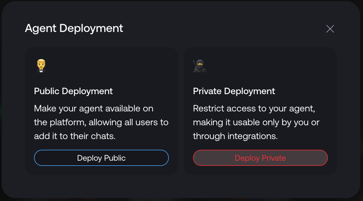 Once you're happy with everything, click Deploy agent in the top menu bar. Select deployment privacy option but don't worry, you can always change it back and forth later.